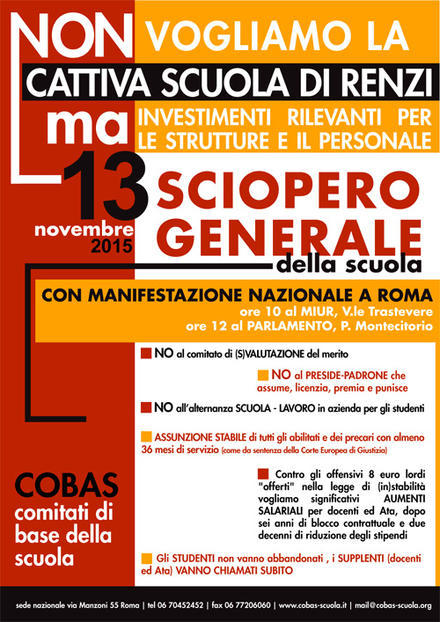 I Cobas hanno proclamato uno sciopero generale della scuola per il 13 novembre, con manifestazione nazionale a Roma per contrastare la controriforma del governo Renzi