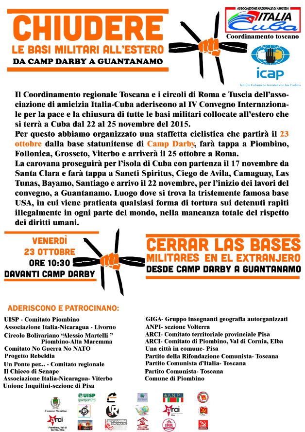 Il Coordinamento Regionale della Toscana e i circoli di Roma e della Tuscia dell’Associazione Nazionale di Amicizia Italia-Cuba aderiscono al IV convegno internazionale per la pace e la chiusura di tutte le basi militari collocate all’estero che si svolgerà a Guantanamo (Cuba) dal 22 al 25 novembre 2015.