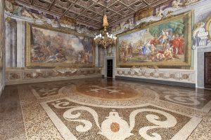 sala_baleari_04-1024x682Gli affreschi, datati 1693, “La conquista delle Baleari e “L’impresa di Sardegna” sono stati dipinti da Giacomo Fardelli, pittore napoletano, su commissione di Ferdinando I de ‘Medici, Granduca di Toscana.