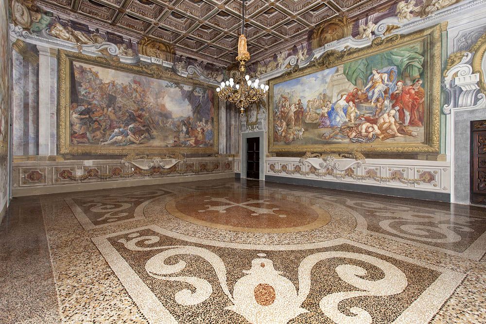 I lavori hanno riguardato gli affreschi e tutto l’apparato decorativo delle pareti, il cassettonato ligneo decorato del soffitto ed il pavimento “seminato alla veneziana”. Sono stati infine realizzati gli impianti elettrico, di illuminazione e di condizionamento.
