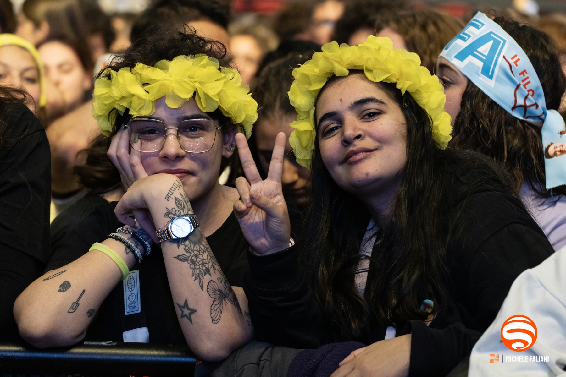Il palco riproduce fedelmente quel mondo: un arcobaleno di colori pastello e la panchina gialla diventano gli elementi di un’atmosfera intima e vibrante, come se ogni spettatore fosse invitato ad accomodarsi dentro il suo universo. Brani come «Testa tra le nuvole, pt. 2», «Wanderlust!», «Tante mila volte» e «Testa tra le nuvole, pt. 1» scorrono come capitoli di un diario aperto, e il pubblico li canta a squarciagola, celebrando la scelta dell’allegria e della leggerezza.