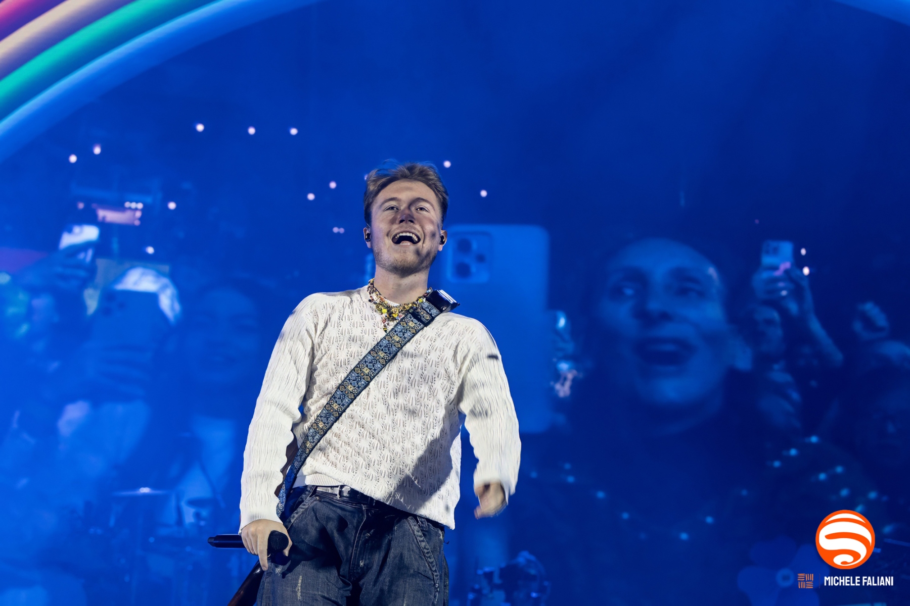Il palco riproduce fedelmente quel mondo: un arcobaleno di colori pastello e la panchina gialla diventano gli elementi di un’atmosfera intima e vibrante, come se ogni spettatore fosse invitato ad accomodarsi dentro il suo universo. Brani come «Testa tra le nuvole, pt. 2», «Wanderlust!», «Tante mila volte» e «Testa tra le nuvole, pt. 1» scorrono come capitoli di un diario aperto, e il pubblico li canta a squarciagola, celebrando la scelta dell’allegria e della leggerezza.