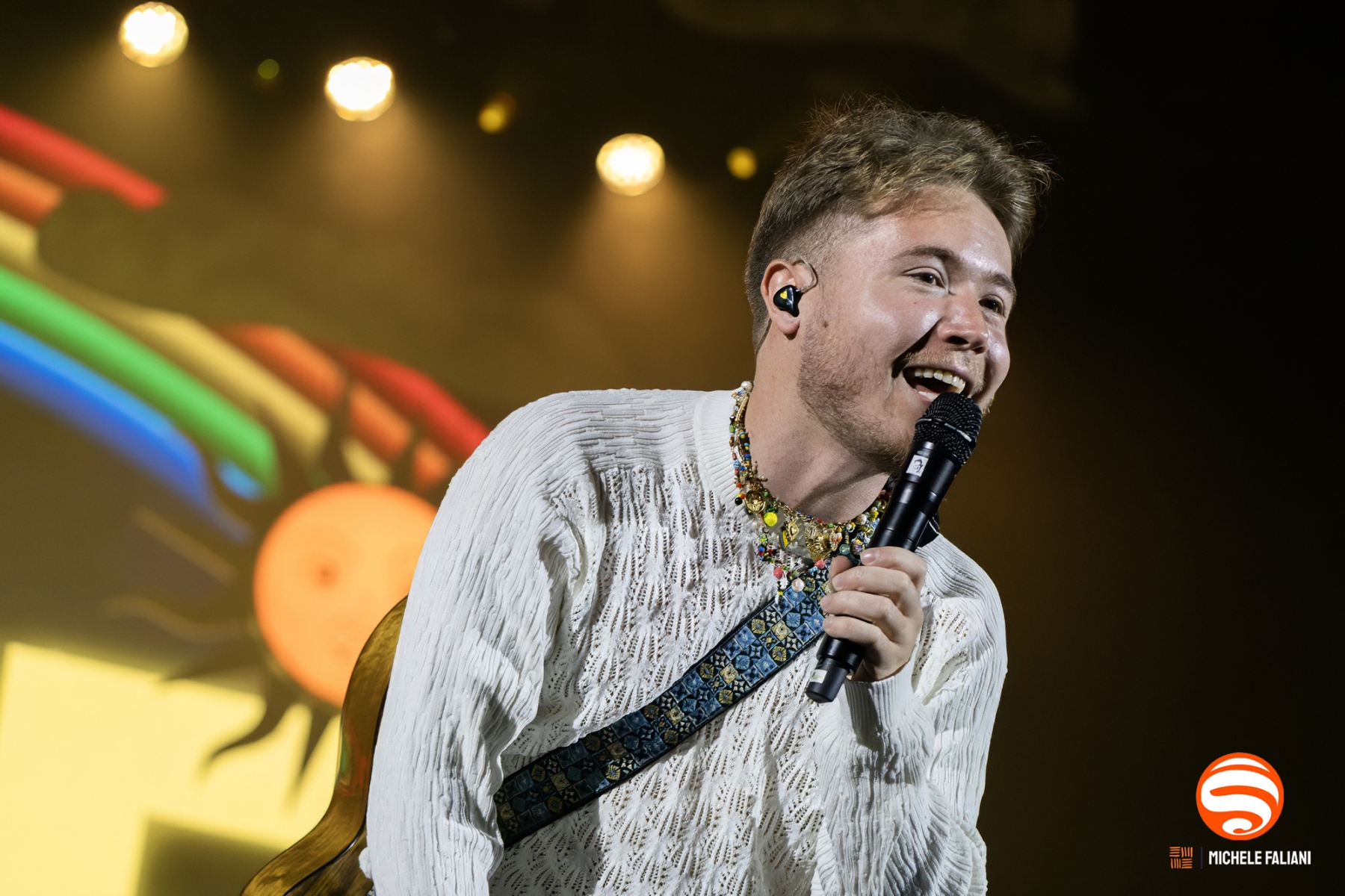 Il palco riproduce fedelmente quel mondo: un arcobaleno di colori pastello e la panchina gialla diventano gli elementi di un’atmosfera intima e vibrante, come se ogni spettatore fosse invitato ad accomodarsi dentro il suo universo. Brani come «Testa tra le nuvole, pt. 2», «Wanderlust!», «Tante mila volte» e «Testa tra le nuvole, pt. 1» scorrono come capitoli di un diario aperto, e il pubblico li canta a squarciagola, celebrando la scelta dell’allegria e della leggerezza.