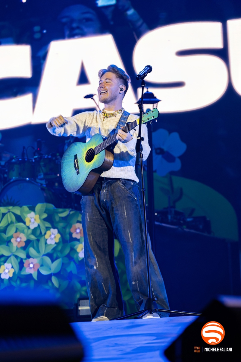 Il palco riproduce fedelmente quel mondo: un arcobaleno di colori pastello e la panchina gialla diventano gli elementi di un’atmosfera intima e vibrante, come se ogni spettatore fosse invitato ad accomodarsi dentro il suo universo. Brani come «Testa tra le nuvole, pt. 2», «Wanderlust!», «Tante mila volte» e «Testa tra le nuvole, pt. 1» scorrono come capitoli di un diario aperto, e il pubblico li canta a squarciagola, celebrando la scelta dell’allegria e della leggerezza.