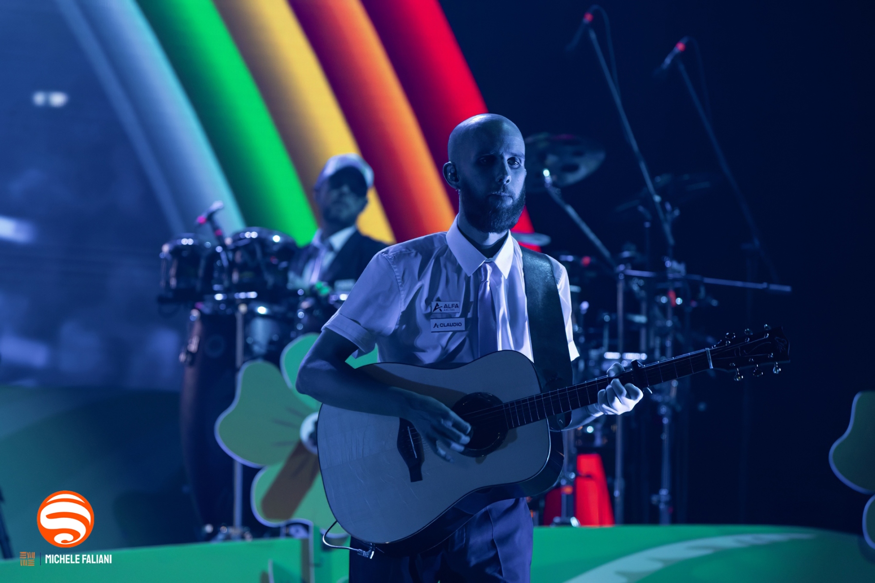 Il palco riproduce fedelmente quel mondo: un arcobaleno di colori pastello e la panchina gialla diventano gli elementi di un’atmosfera intima e vibrante, come se ogni spettatore fosse invitato ad accomodarsi dentro il suo universo. Brani come «Testa tra le nuvole, pt. 2», «Wanderlust!», «Tante mila volte» e «Testa tra le nuvole, pt. 1» scorrono come capitoli di un diario aperto, e il pubblico li canta a squarciagola, celebrando la scelta dell’allegria e della leggerezza.