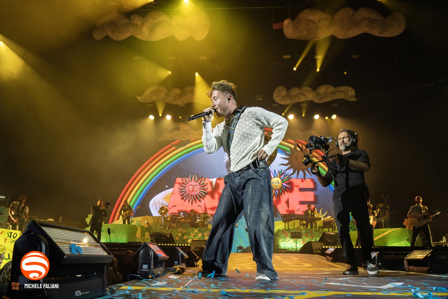Il palco riproduce fedelmente quel mondo: un arcobaleno di colori pastello e la panchina gialla diventano gli elementi di un’atmosfera intima e vibrante, come se ogni spettatore fosse invitato ad accomodarsi dentro il suo universo. Brani come «Testa tra le nuvole, pt. 2», «Wanderlust!», «Tante mila volte» e «Testa tra le nuvole, pt. 1» scorrono come capitoli di un diario aperto, e il pubblico li canta a squarciagola, celebrando la scelta dell’allegria e della leggerezza.