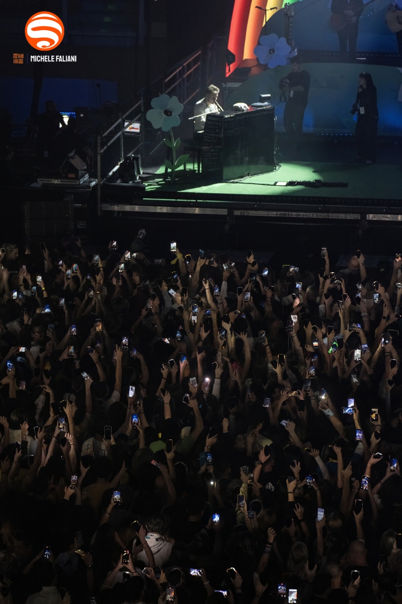 Il palco riproduce fedelmente quel mondo: un arcobaleno di colori pastello e la panchina gialla diventano gli elementi di un’atmosfera intima e vibrante, come se ogni spettatore fosse invitato ad accomodarsi dentro il suo universo. Brani come «Testa tra le nuvole, pt. 2», «Wanderlust!», «Tante mila volte» e «Testa tra le nuvole, pt. 1» scorrono come capitoli di un diario aperto, e il pubblico li canta a squarciagola, celebrando la scelta dell’allegria e della leggerezza.