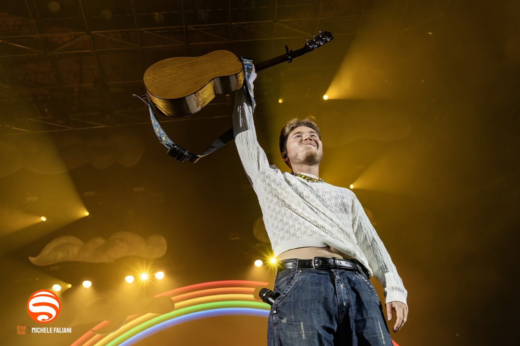 Il palco riproduce fedelmente quel mondo: un arcobaleno di colori pastello e la panchina gialla diventano gli elementi di un’atmosfera intima e vibrante, come se ogni spettatore fosse invitato ad accomodarsi dentro il suo universo. Brani come «Testa tra le nuvole, pt. 2», «Wanderlust!», «Tante mila volte» e «Testa tra le nuvole, pt. 1» scorrono come capitoli di un diario aperto, e il pubblico li canta a squarciagola, celebrando la scelta dell’allegria e della leggerezza.