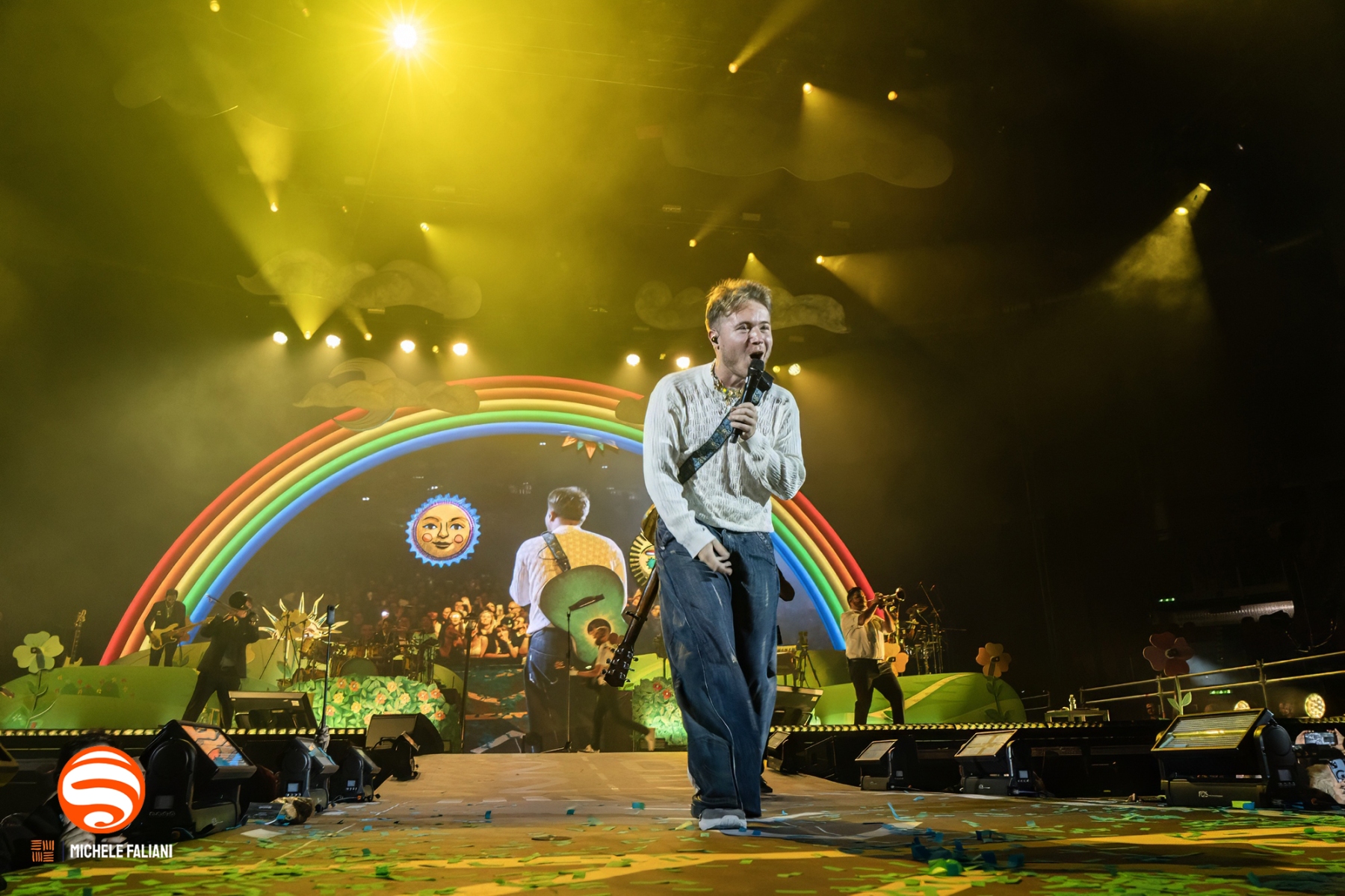 Il palco riproduce fedelmente quel mondo: un arcobaleno di colori pastello e la panchina gialla diventano gli elementi di un’atmosfera intima e vibrante, come se ogni spettatore fosse invitato ad accomodarsi dentro il suo universo. Brani come «Testa tra le nuvole, pt. 2», «Wanderlust!», «Tante mila volte» e «Testa tra le nuvole, pt. 1» scorrono come capitoli di un diario aperto, e il pubblico li canta a squarciagola, celebrando la scelta dell’allegria e della leggerezza.