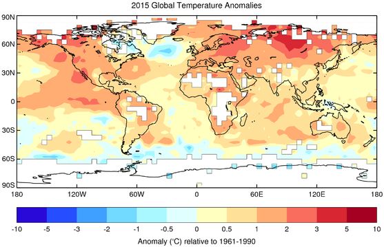 Tuttavia, è la tendenza degli ultimi mesi a destare grande preoccupazione tanto da spingere Stefan Rahmstorf del Potsdam Institute for Climate Impact Research a dichiarare che “Siamo in una sorta di emergenza climatica. La situazione è davvero stupefacente e assolutamente senza precedenti”. Secondo i dati della Nasa siamo in presenza del quinto mese consecutivo in cui la temperatura media supera di un grado quella del trentennio di riferimento, con un trend crescente estremamente preoccupante. I primi due mesi del 2016 sono stati, infatti, preceduti dagli ultimi 3 del 2015 anch’essi con temperature abbondantemente oltre la media: ottobre (+1.06 gradi), novembre (+1.03) e dicembre (+1,10). Estendendo l’analisi a tutto il 2015 rileviamo come, sempre in base ai dati forniti dalla Nasa e dall’Agenzia Federale per la Meteorologia (Noaa), siano stati ben 10 i mesi che hanno registrato un record di temperatura media, con le uniche eccezioni di gennaio ed aprile. Nell’arco dell’intero anno la temperatura media terrestre è risultata di un grado superiore a quella del decennio 1880-1889, il primo dall’inizio delle rilevazioni, superando il precedente record del 2014 di 0,14 gradi. Situazione, come stigmatizzato dai meteorologi, estremamente preoccupante non solo per il record del 2015, il più caldo degli ultimi 136 anni, ma, soprattutto, per l’inarrestabile trend crescente delle temperature medie mensili.