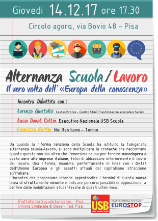 Incontro dibattito su: “Il vero volto dell’ Europa della conoscenza”, promosso da Unione Sindacale di Base e Piattaforma Sociale Eurostop, Pisa. Al Circolo agorà di Pisa in Via Bovio 48. Giovedì 14 Dicembre dalle ore 17,30. Parteciperanno: