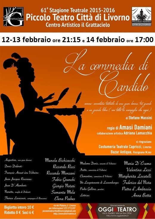 Venerdì 12 ore 21:15, sabato 13 ore 21:15 e domenica 14 ore 17:00 presso il Centro Artistico il Grattacielo (via del Platano, Livorno) la Compagnia “Piccolo Teatro Città di Livorno” porta in scena “La Commedia di Candido” di Stefano Massini. La regia di Amasi Damiani, la cui prestigiosa carriera di regista, scrittore e sceneggiatore da 60 anni si intreccia con il Grattacielo e il Piccolo, che da 61 anni è la compagnia teatrale stabile del Grattacielo