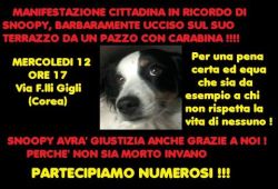 cane SnoopyIn riferimento a quanto è successo nel quartiere di Corea, il 4agosto tra le ore 7:15 e le 7:45 dove  il cane di Arianna Lucisano, è stato ucciso, sul terrazzo, con un colpo di carabina e con la confessione di chi ha sparato, è scattata su facebook l’iniziativa per ricordare Snoopy