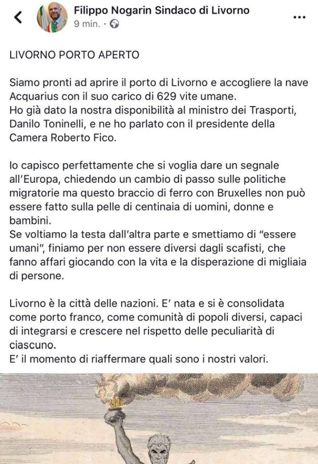 In un primo momento anche Filippo Nogarin, tramite un post su Facebook, ha annunciato l’apertura del porto di Livorno, pronto ad accogliere la nave Aquarius ed il suo carico di vite umane, riaffermando così i valori cari alla città.