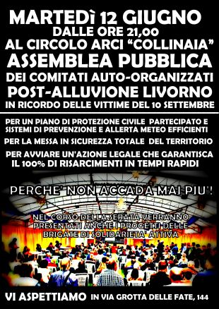 Martedì 12 Giugno dalle ore 21,00 presso i locali del Circolo Arci “Collinaia” di via grotta delle Fate , 144. si svolgerà una pubblica assemblea del coordinamento dei Comitati auto-organizzati dopo la tragica alluvione che ha colpito Livorno nella notte tra il 9 e il 10 settembre scorso