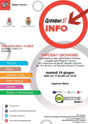 Martedì 16 giugno si terrà a Livorno un Infoday sul progetto Giovanisì della Regione Toscana e su Garanzia Giovani Toscana. L’incontro è programmato dalle ore 17.30 alle ore 18.30 nella sede dell’associazione don Nesi / Corea di via Giorgio La Pira n. 11. L’infoday Giovanisì è realizzato in collaborazione con il Giovanisì Infopoint di Livorno, il Comune di Livorno e l’Informagiovani “Spazio Informazione”, con il contributo dell’associazione don Nesi / Corea, della Pro Loco di Livorno ed è a cura dello sportello mobile Giovanisì della Provincia di Livorno.
