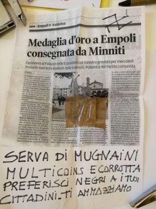 Gravissime le minacce di morte arrivate alla sindaca di Empoli con una lettera che conteneva proiettili e una svastica. Ancor più inaccettabili, se possibile, perché recapitate dopo che mercoledì scorso la Città di Empoli è stata insignita della Medaglia d’Oro per la Resistenza ed anche perché, quest’anno cade l’80° della pagina più buia dell’Italia, la promulgazione delle leggi raziali.