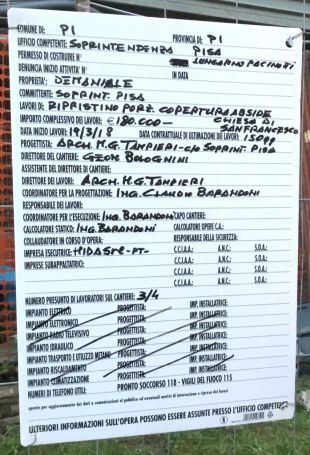 - L’ ordinanza comunale di occupazione di suolo pubblico n. 341 rilasciata in data 28 febbraio 2018, e affissa sul cantiere in Via Buonarroti, prevedeva che dal giorno 8 marzo al 30 aprile 2018 – ovvero con chiusura oggi – sia attivo il cantiere voluto dalla Soprintendenza di Pisa per lavori di messa in sicurezza delle coperture dell’apside e delle adiacenti cappelle del transetto della chiesa di San Francesco, il cui tetto è crollato nel settembre 2015.
