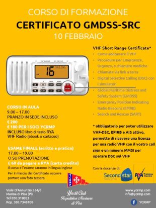Si tratta di imparare l’utilizzo di un sistema di comunicazione radio concepito per la sicurezza marittima e per la gestione delle emergenze che consente di comunicare situazioni di pericolo e richiedere soccorso rapidamente alle autorità costiere o alle imbarcazioni nelle vicinanze. Per utilizzare questi sofisticati dispositivi è necessario il possesso di un certificato a garanzia del livello di competenza raggiunto dopo un corso tenuto da personale qualificato. Lo Ycrmp metterà a disposizione i suoi locali in Cala d’Arno sul Viale D’Annunzio a Marina di Pisa dove sabato 10 febbraio, con orario 9-17, verranno affrontati tutti gli aspetti relativi all’utilizzo di questi dispositivi, da come si usa un Vhf alle procedure per emergenze e chiamate mediche, dalla trasmissione digitale dei dati (Dsc) all’uso di un trasmettitore dati per le situazioni d’emergenza.