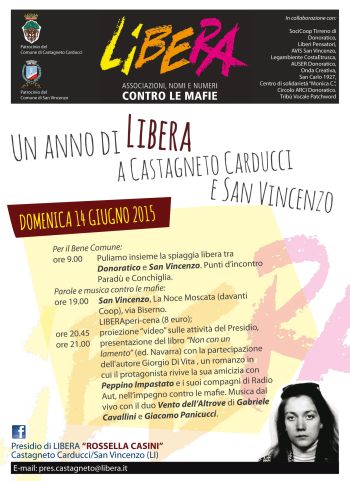 Il prossimo 14 giugno, domenica, il Presidio di Libera “Rossella Casini” di Castagneto Carducci/San Vincenzo ricorderà il suo primo anno di attività, che ha visto l’adesione e la partecipazione di tante persone e di numerose Associazioni locali
