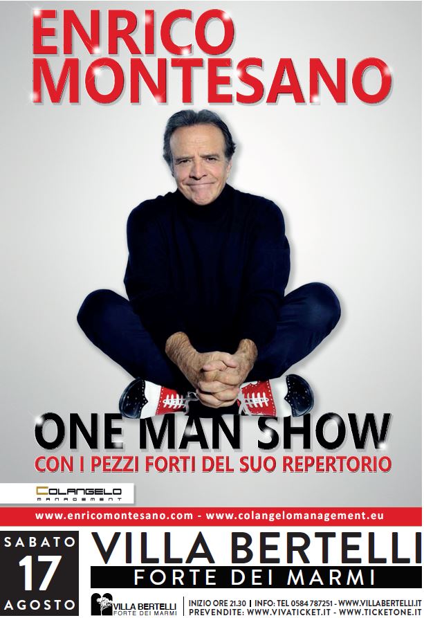 Allegria, risate e divertimento con Enrico Montesano e il suo nuovo spettacolo dal titolo: “One Man Show“, in programma a Villa Bertelli a Forte dei Marmi sabato 17 agosto alle 21.30. Il grande attore comico riproporrà i pezzi forti” del suo indimenticabile repertorio, ma con testi nuovi di zecca. Dopo una lunga serie di sold out con Rugantino e Il Conte Tacchia Montesano presenta i gioielli rivisitati e aggiornati della sua prestigiosa carriera, con le imitazioni, le barzellette, le canzoni satiriche e nuovi personaggi, come il Rapper Femo Blas, per gli amici Blas Femo, e monologhi sulla nostra attualità, che di spunti ne offre quotidianamente: ce n’è per tutti i gusti! Tornano i suoi più noti personaggi, nati alla radio nelle fortunatissime serie di Gran Varietà: dalla Romantica Donna Inglese, a Torquato il pensionato, a Dudù e Cocò, a Zia Sally con i suoi strampalati consigli, al professor Taddeo Rufus nel suo ridicolo bricolage e tanti, tanti altri.