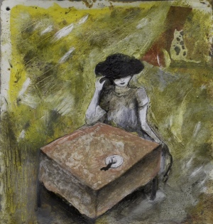 Isabella Staino ci accompagnerà in questa narrazione con la minuzia grafica delle forme, e nello stesso tempo con le ombre e i colori di una tavolozza decisa, dove gli ocra, le terre, gli aranci scaldano tele di dimensioni spesso notevoli, su fondali di celesti e verdi luminosi, come in “Due tempi”, olio e acrilico di 200×150 o “Interno”, olio, acrilico, cera e carta di 200×180. La stessa intensità e visionarietà si ritrova, in una concentrazione miniaturistica, nelle opere su carta.