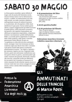- h 18 presentazione del libro con l’autore Marco Rossi, “Gli Ammutinati delle trincee” dalla guerra in Libia al primo conflitto mondiale 1911-1918 (BFS, 2014)