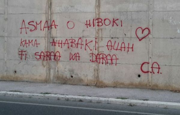 scritta via della pace piombinoLa cara amica Rabia Sanhaji mi ha fornito la traduzione di questa bella scritta d’amore sul muro di via della Pace a Piombino:
