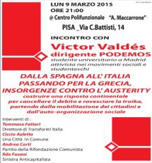 Per parlare di questi argomenti, sarà con noi Victor Valdés, dirigente di Podemos, studente universitario a Madrid e attivista dei movimenti sociali e studenteschi Interverranno: Tommaso Fattori (direttore di Transform! Italia), Ciccio Auletta (Una città in comune), Andrea Corti (PRC) e Ildo Fusani (Sinistra Anticapitalista).
