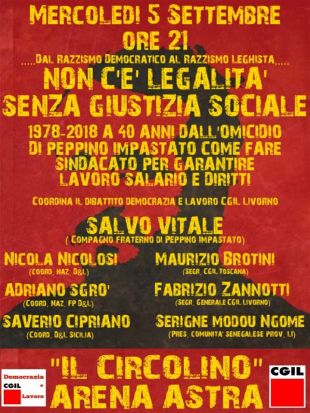 A 40 anni dall’omicidio di Peppino Impastato: come fare sindacato per garantire lavoro, salario e diritti”. L’evento, in programma per il prossimo 5 settembre alle 21 presso “Il Circolino” Arena Astra, è organizzato dall’area programmatica “Democrazia e lavoro” in collaborazione con la Cgil Livorno.