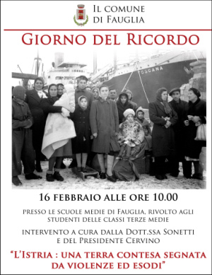 • GiornoRicordoFaugliaIl secondo appuntamento, in collaborazione con la cooperativa Microstoria, si terrà a Fauglia (Pisa) martedì 16 febbraio alle ore 10. Presso le scuole medie di Fauglia, si terrà l’incontro rivolto agli alunni di terza, dal titolo: “L’Istria: una terra contesa segnata da violenze ed esodi”. Parteciperanno il direttore Istoreco Catia Sonetti e Mario Cervino, vicepresidente dell’ANVGD.