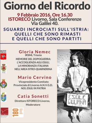 L’Istituto Storico della Resistenza e della Società Contemporanea nella provincia di Livorno (Istoreco) organizza per il Giorno del Ricordo 2016 una serie di iniziative tra Livorno, San Vincenzo e Fauglia. Com’è noto è stata la Legge n. 94 del 30 marzo 2004 a istituire questa particolare ricorrenza «al fine di conservare e rinnovare la memoria della tragedia degli italiani e di tutte le vittime delle foibe, dell’esodo dalle loro terre degli istriani, fiumani e dalmati nel secondo dopoguerra e della più complessa vicenda del confine orientale».