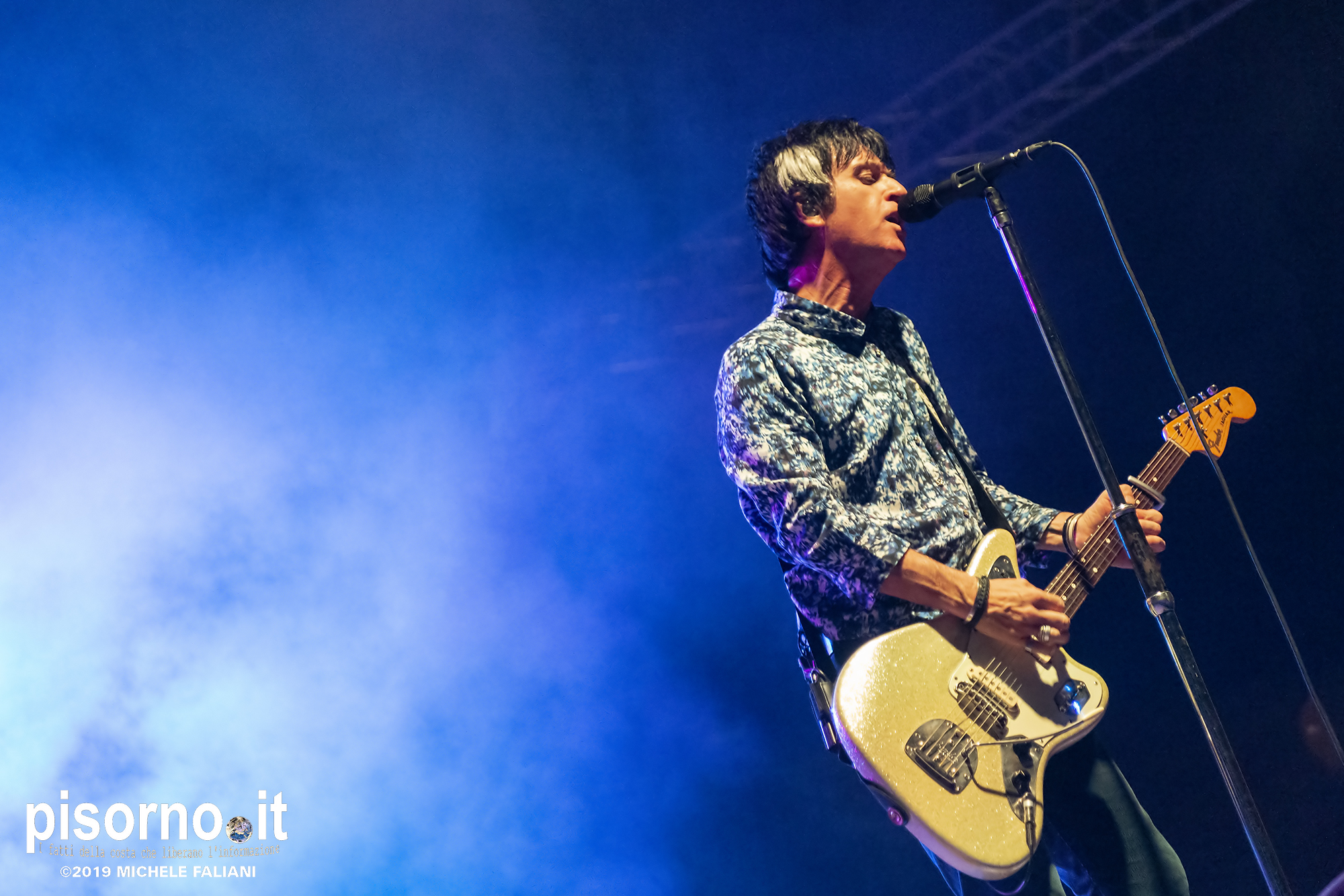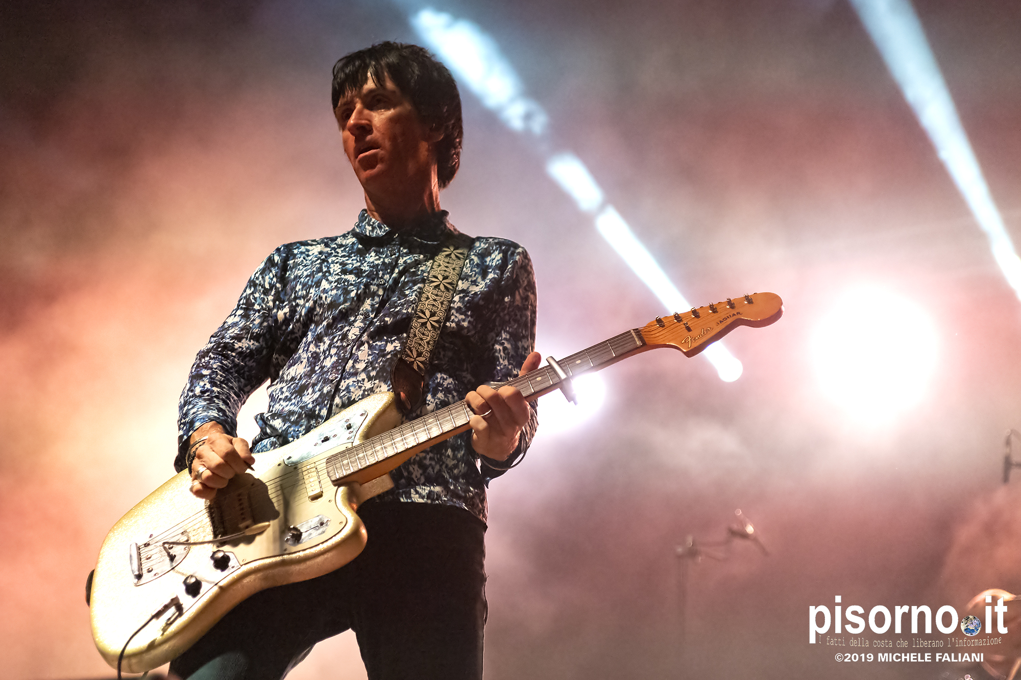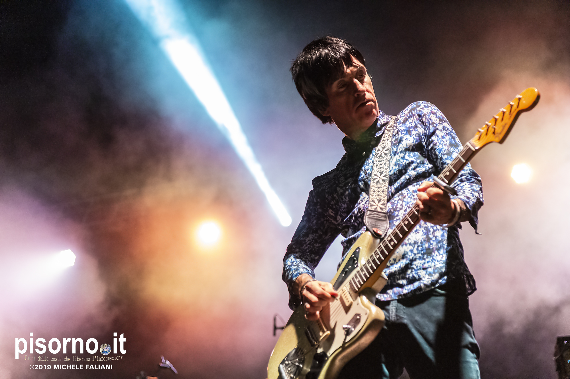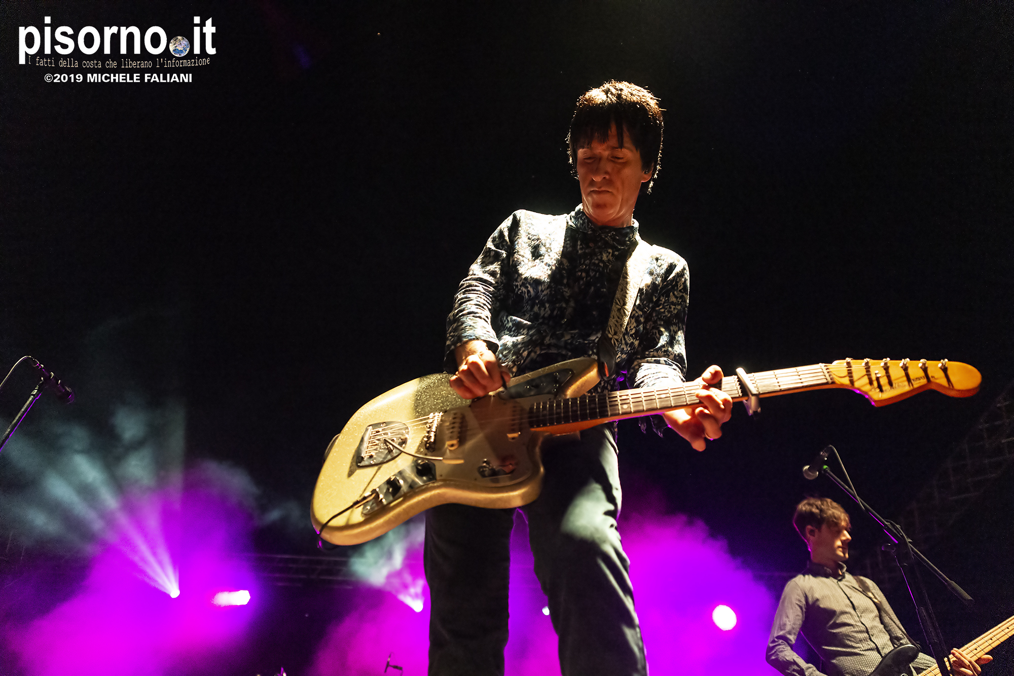 La Rocca Malatestiana di Cesena è un gioiello, e da quando i ragazzi di acieloaperto (bellissimo festival che si svolge ogni anno e che nelle passate edizioni ci ha visto ospiti per i concerti di Devendra Banhart e dei Calexico) ci organizzano concerti come quello di Johnny Marr, ci appare ancora più bella. Non sarò molto obbiettivo a parlare di questo concerto, visto che Johnny (e Morrissey, ovviamente) e gli Smiths sono stati insieme ai R.E.M. il grande amore della mia vita; sarebbe come far parlare Carlo Verdone di Jimi Hendrix, o Francesco De Gregori di Bob Dylan. Ma quello di Cesena, credetemi, è stato davvero perfetto. Strepitoso, anche più di quello dello scorso inverno a Milano, forse perché allora “Call the comet” era appena uscito e adesso che gli ascolti sono arrivati in tripla cifra mi sono sentito più coinvolto anche dalla scelta dei brani. Scelta che ha visto ben 6 canzoni del catalogo degli Smiths (con “Bigmouth strikes again” piazzata seconda in scaletta, per una delle tante ovazioni del pubblico), 2 del disco con gli Electronic e una cover di “I feel you” dei Depeche Mode, che usci su 7″ per il Record Store Day del 2015. Il resto della setlist è stato quasi tutto appannaggio del già citato “Call the comet”, uno dei dischi più belli del 2018, mentre per “The messenger” e per “Playland” c’è stato spazio soltanto per i due singoloni “New town velocity” e “Easy money”. Ma in tutte le 20 tracce del concerto il protagonista è stato lui, che con la sua Fender Jaguar ha deliziato me e tutti gli altri spettatori con i suoi geniali arpeggi e i suoi irresistibili riff, che lo hanno consacrato come uno dei chitarristi più seminali e più identificabili della storia del rock. Sì, certo. Siamo stati per un’ora e mezzo ad ascoltare un genio che ha scritto parecchie pagine della storia del rock degli ultimi 35 anni. È un appuntamento che, alla prossima occasione che Marr verrà in Italia, vi conviene non mancare.