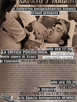 Sabato 7 maggio alle ore 17:30 c/o Spazio Antagonista NEWROZ in via Garibaldi 72 a Pisa, il Collettivo Antipsichiatrico Antonin Artaud presenta “La critica psichiatrica. Nelle opere di Szasz e Foucault” di Gabriele
