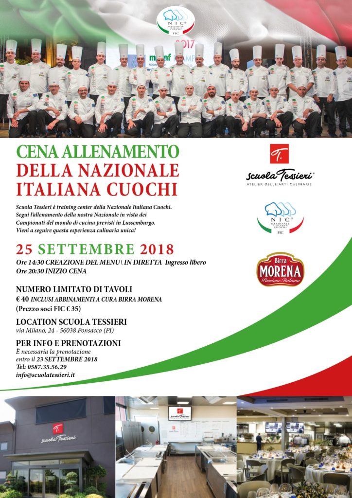 Scuola Tessieri è stata selezionata come Training Center della Nazionale Italiana Cuochi, prossima a partecipare ai campionati del mondo della cucina, previsti in Lussemburgo dal 24 al 28 novembre 2018. Due i giorni di lavoro della NIC alla Tessieri: la giornata del 24 settembre sarà dedicata alle preparazioni e all’elaborazione del menù; il 25 settembre, dalle ore 14:30, le porte della Scuola si apriranno agli ospiti che, attraverso una grande parete a vetro, vorranno assistere all’allenamento della NIC (ingresso libero). Nei laboratori di cucina e pasticceria di Ponsacco, la squadra di chef coordinata dal General Manager Gaetano Ragunì, sarà impegnata nella creazione di un elaborato menù, in degustazione in serata alla Scuola, in occasione di una cena esclusiva aperta a 95 partecipanti (su prenotazione: costo €40, €35 per i soci FIC). Intrigante il menù, con 3 portate (starter, main course e dessert) e coccole finali offerte dalla Tessieri. Partner dell’evento è Birra Morena, che accompagnerà ogni piatto con le proprie birre.