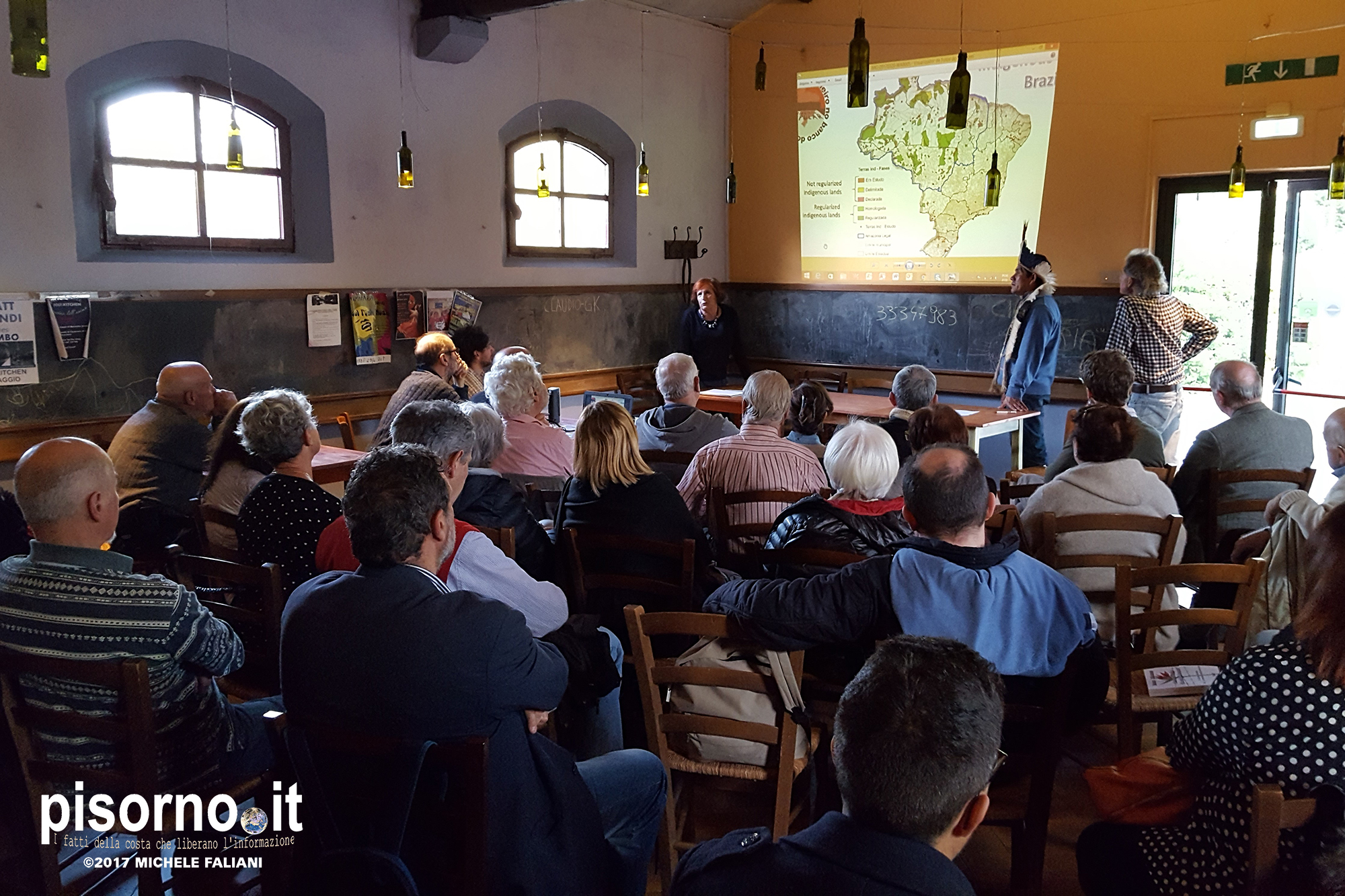 Il racconto, lucido ma coinvolgente, del Leader indigeno ha ripercorso la complessa storia a partire dal 1988, anno d’entrata in vigore della nuova Costituzione che, all’articolo 16, riconosceva i diritti dei popoli nativi, prevedendo anche la demarcazione e la restituzione entro 4 anni delle “terre indigene” alle comunità amerindie. Disposizione attuata nei decenni successivi con estrema lentezza dai vari governi succedutisi, tant’è che, non solo, le terre effettivamente restituite ad oggi sono solo una minima parte di quelle costituzionalmente previste ma, la repressione e l’espulsione dai propri territori continua con intensità crescente da quando nell’estate scorsa si è insediato il presidente Temer, a seguito del Golpe istituzionale che ha deposto la Presidente Dilma Rousseff, con governo sostenuto da una maggioranza di centro-destra, al cui interno è rilevante la presenza di rappresentanti dei Fazenderos, i latifondisti brasiliani.