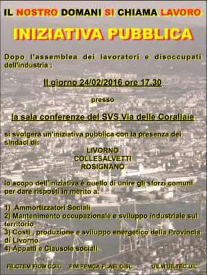 6) L’adeguamento infrastrutturale viario, ferroviario e portuale accompagnato dall’innovazione tecnologica delle imprese a una programmata politica di riconversioni impiantistiche possono portare benefici, qualitativi e ambientali, da un forte sostegno formativo per i lavoratori si possono creare le condizioni per difendere il lavoro e crearne di nuovo, così come le bonifiche dei siti inquinati questo è quello che i lavoratori e i disoccupati livornesi dell’industria chiedano alle istituzioni tenendo presente che nessuna azione per quanto virtuosa e scaturita da buoni intenti, avrà un futuro se non costruita nella condivisione e nella trasparenza tra tutti i soggetti interessati.