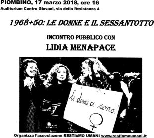 Sabato prossimo, 17 marzo alle ore 16:00, presso il Centro Giovani di Piombino (viale della Resistenza), si terrà un incontro pubblico con Lidia Menapace sul tema “Le donne e il Sessantotto” organizzato dall’associazione ‘Restiamo umani’.