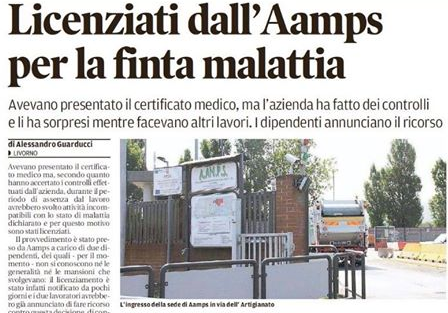 La civetta de Il Tirreno di ieri esce con titolo a lettere cubitali sul licenziamento in tronco di due dipendenti di Aamps per (presunta) falsa malattia