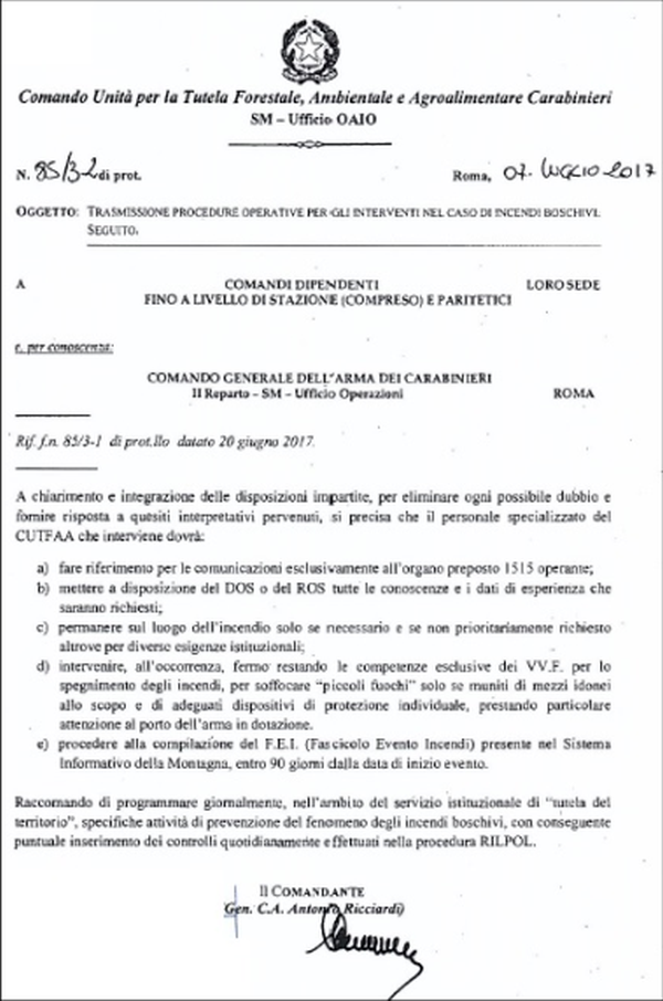 Le vette dell’assurdo sono però raggiunte da una disposizione di servizio del 7 luglio scorso, emanata dal comando generale dei Carabinieri, in cui si chiarisce una volta per tutte cosa devono fare in caso di incendio boschivo gli ex Forestali entrati nell’Arma: niente.