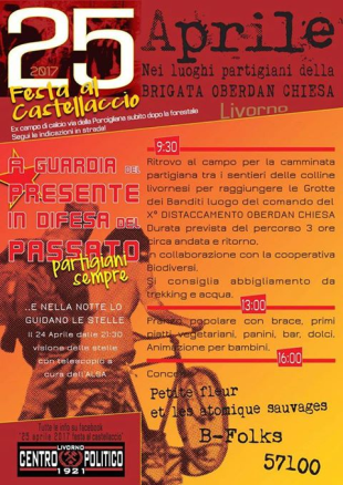 a cura del Centro Politico 1921: alle ore 9.30 ritrovo all’ex campo di calcio di via della Porcigliana per la “camminata partigiana” tra i sentieri delle colline livornesi per raggiungere la “Grotta dei Banditi” (durata del percorso 3 ore andata e ritorno con abbigliamento da trekking). Alle ore 13, braciata e nel pomeriggio concerti e intrattenimento per bambini.