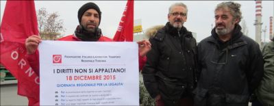 Oggi ai cancelli della Raffineria Eni di Stagno, la Filt Cgil di Livorno ha indetto una conferenza stampa in merito all’iniziativa di carattere regionale per “la legalità negli appalti per il rispetto di contratti e regole nel lavoro”, alla presenza di: Claudio Picchiottino (segretario Filt Cgil Livorno) e Giuseppe Gucciardo (responsabile dipartimento merci/logistica Filt Cgil Livorno)