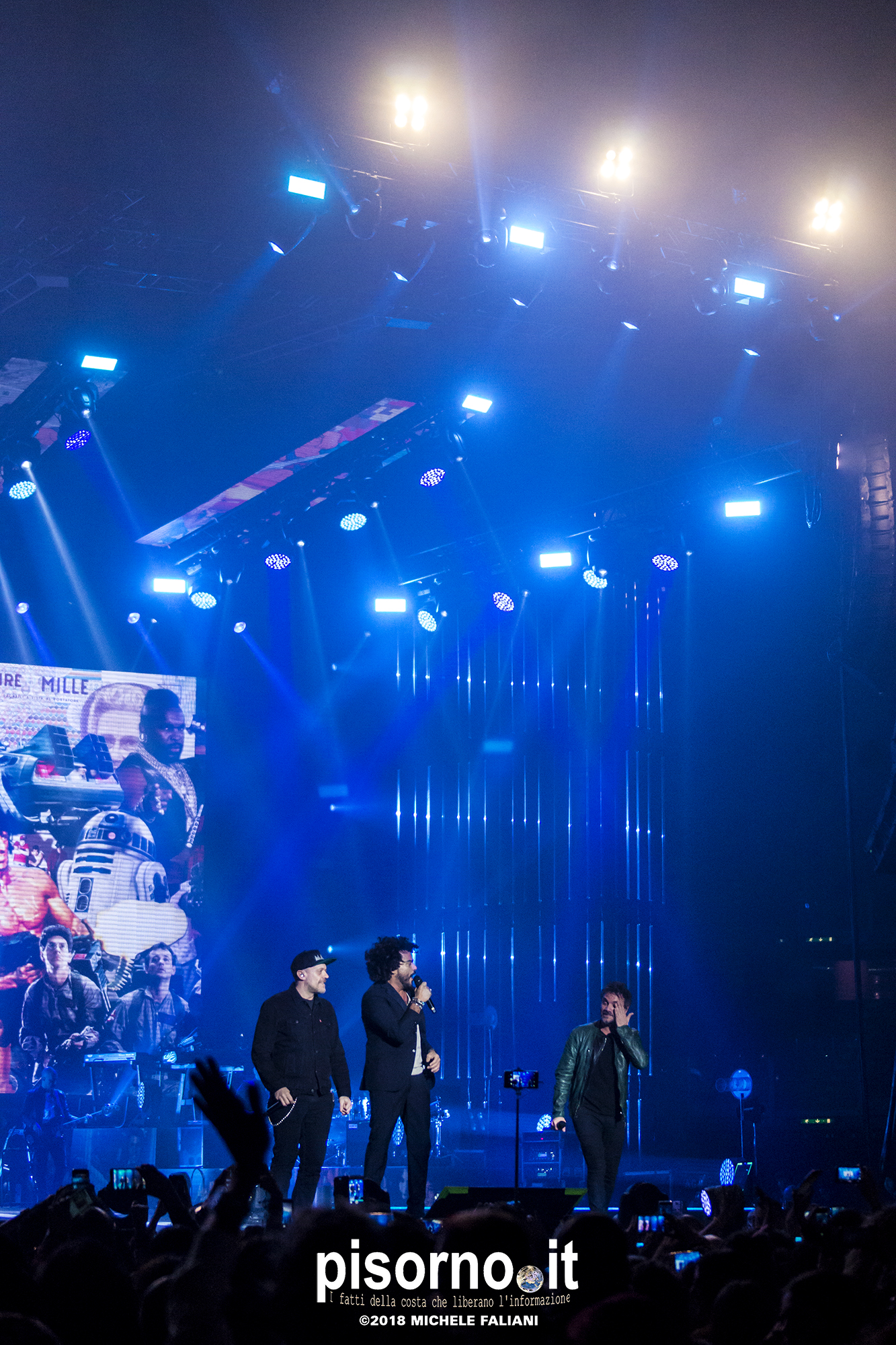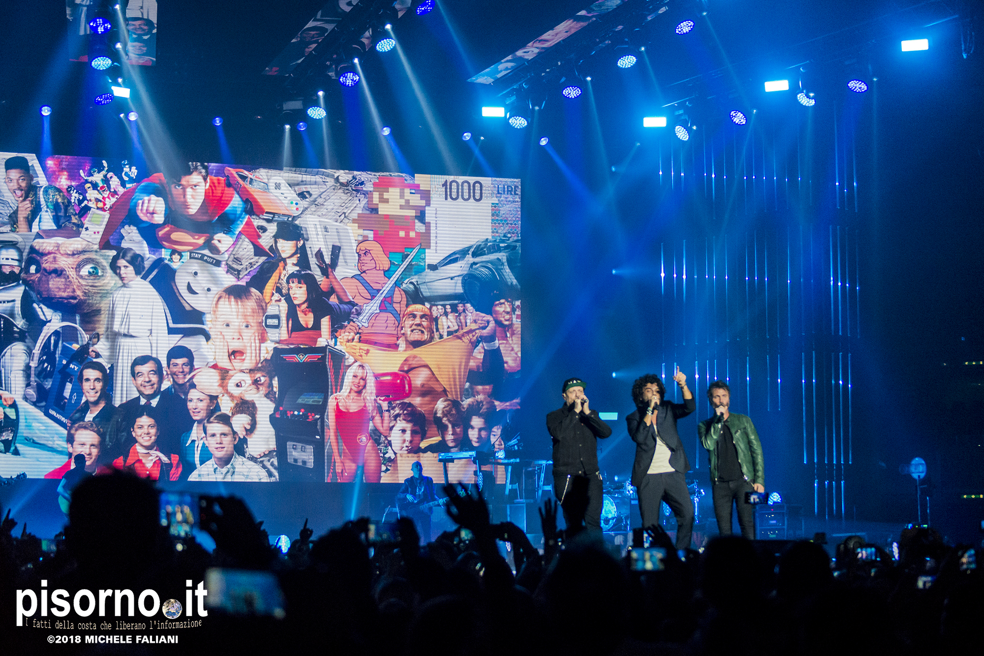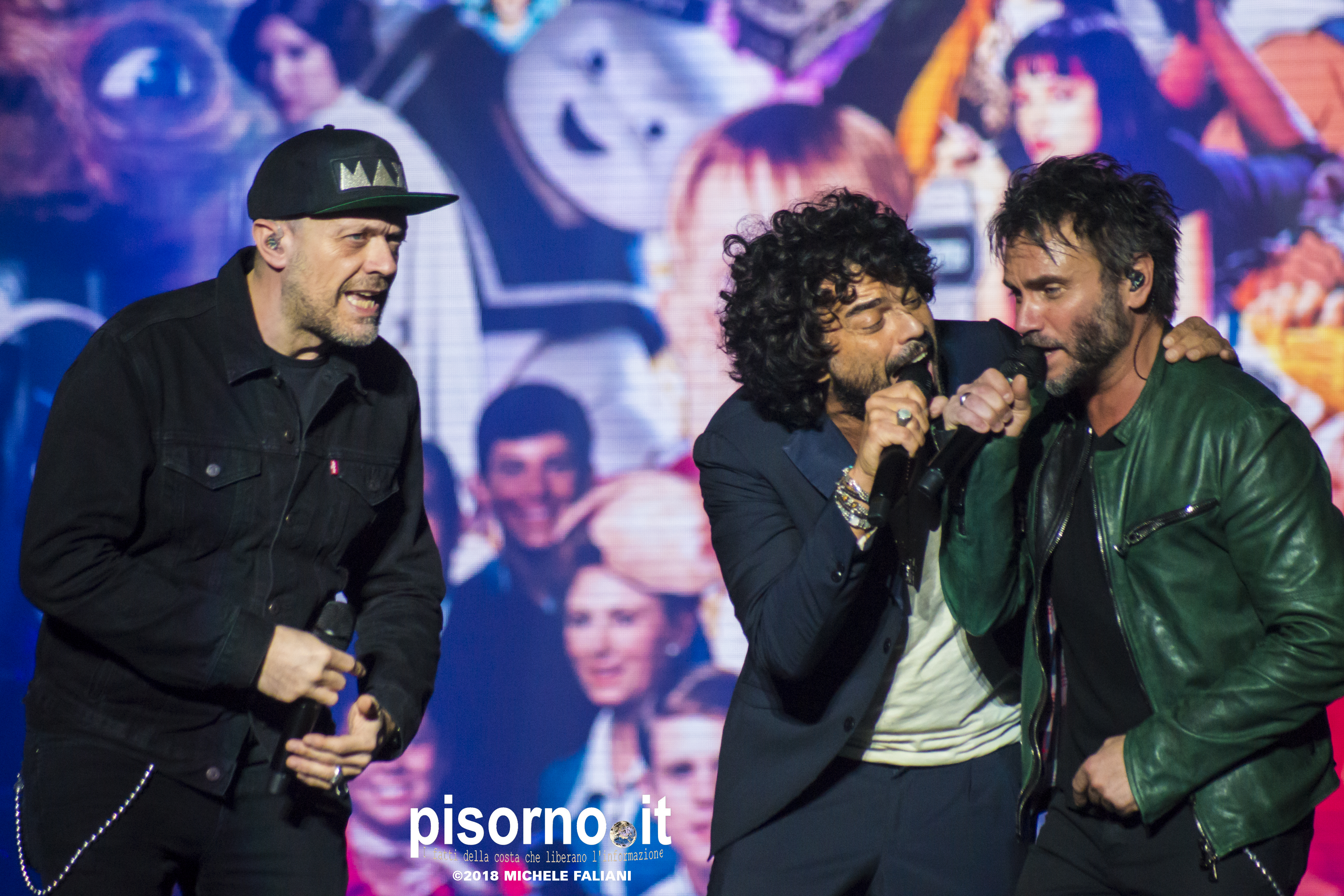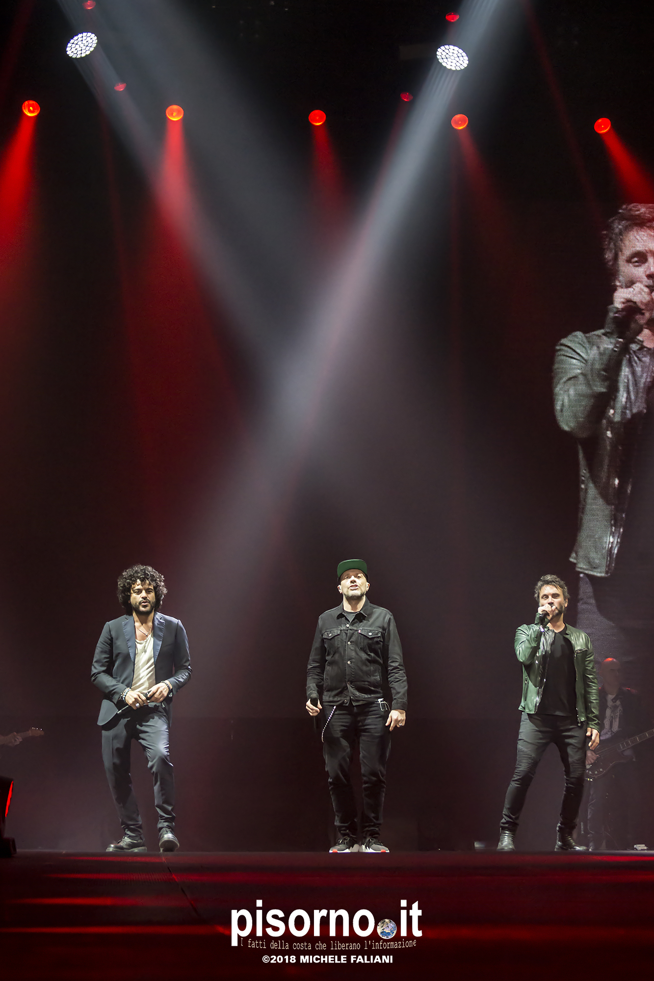 Ok, non saremo ai livelli degli storici tour di Dalla & De Gregori o di De André con la PFM, ma trovatemi tre artisti capaci di mettere insieme i loro numeri: Pezzali ha venduto più di 7 milioni di dischi, Renga ha quasi toccato il numero dei 2000 concerti (carrieria con i Timoria compresa), Nek è l’artista più suonato dalle radio ogni volta che pubblica un disco. Inevitabile che questo tour congiunto (idea nata durante le registrazioni di “Duri da battere”, singolo di Max Pezzali con ospiti i due amici) riscuotesse il successo che sta avendo. Anche al Modigliani Forum di Livorno sold out sfiorato e pubblico in delirio per quasi due ore mezzo, con uno dopo l’altro alcuni degli inni della musica pop dai ’90 in poi: Gli anni, Il mio giorno più bello nel mondo, Laura non c’è, Hanno ucciso l’Uomo Ragno e tante altre. Una bella festa che ha reso felici migliaia di persone. E non è questo lo scopo dei concerti dal vivo?