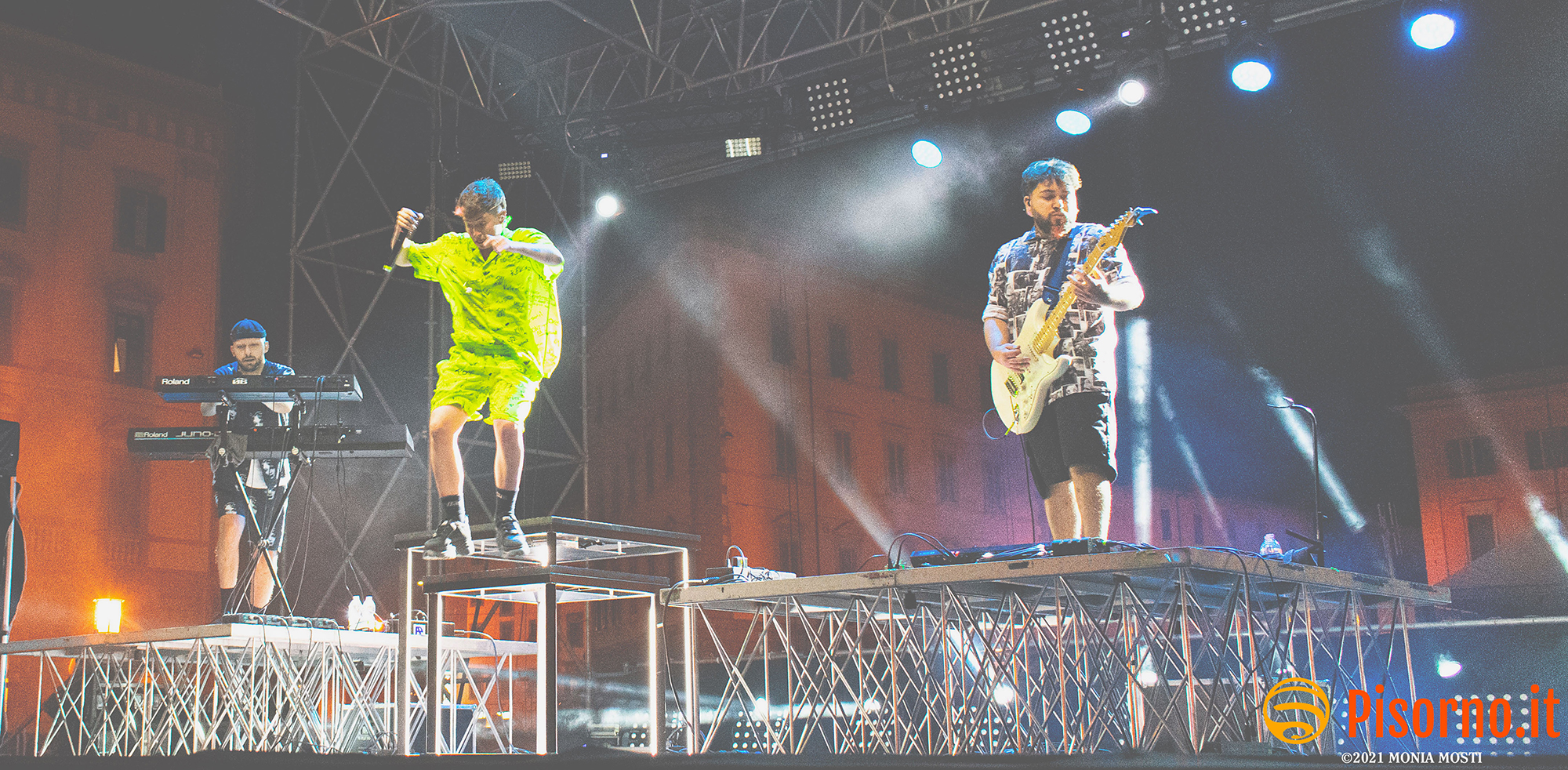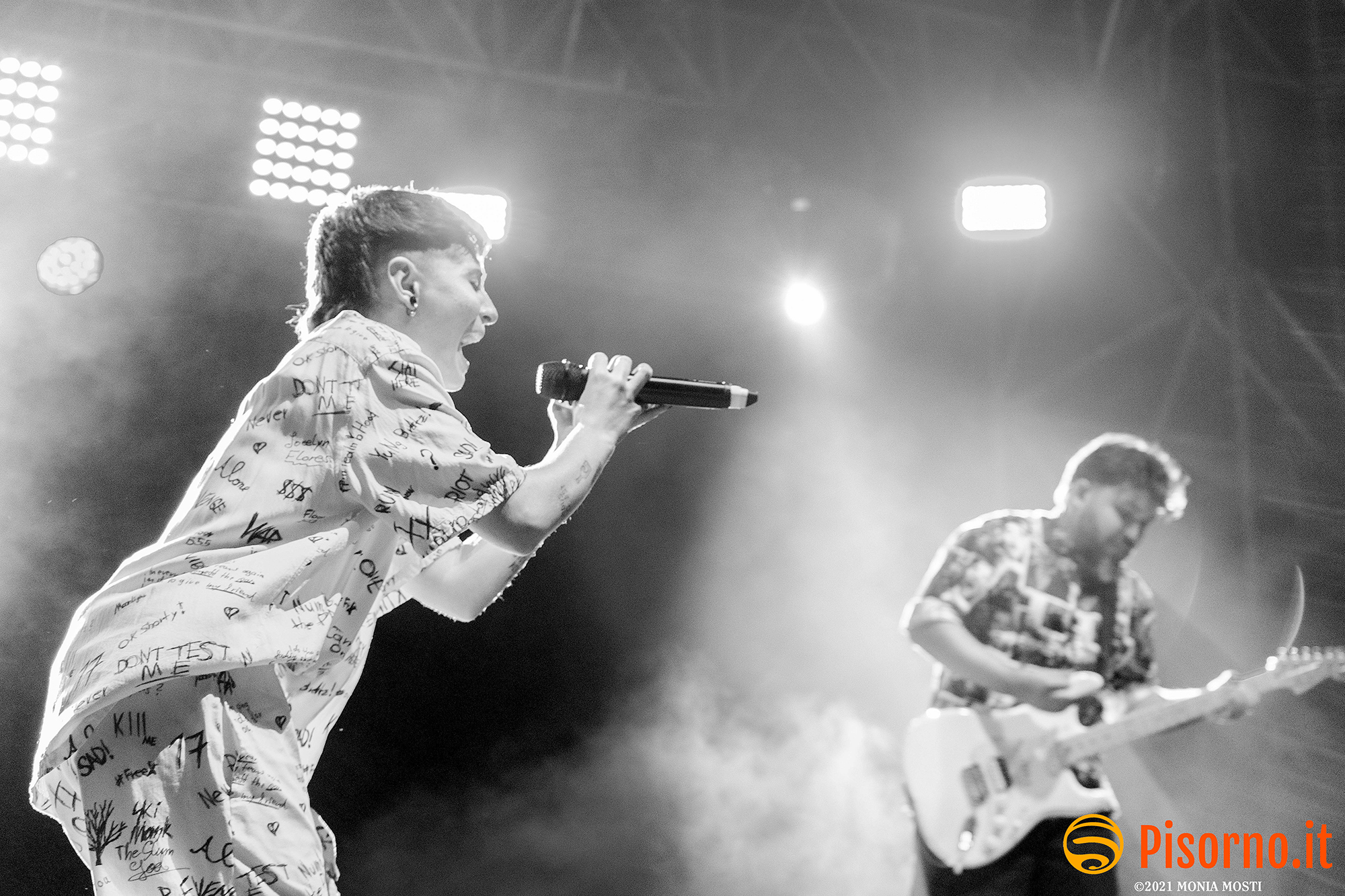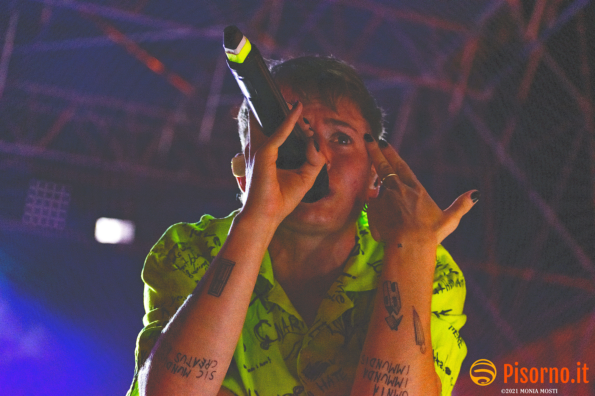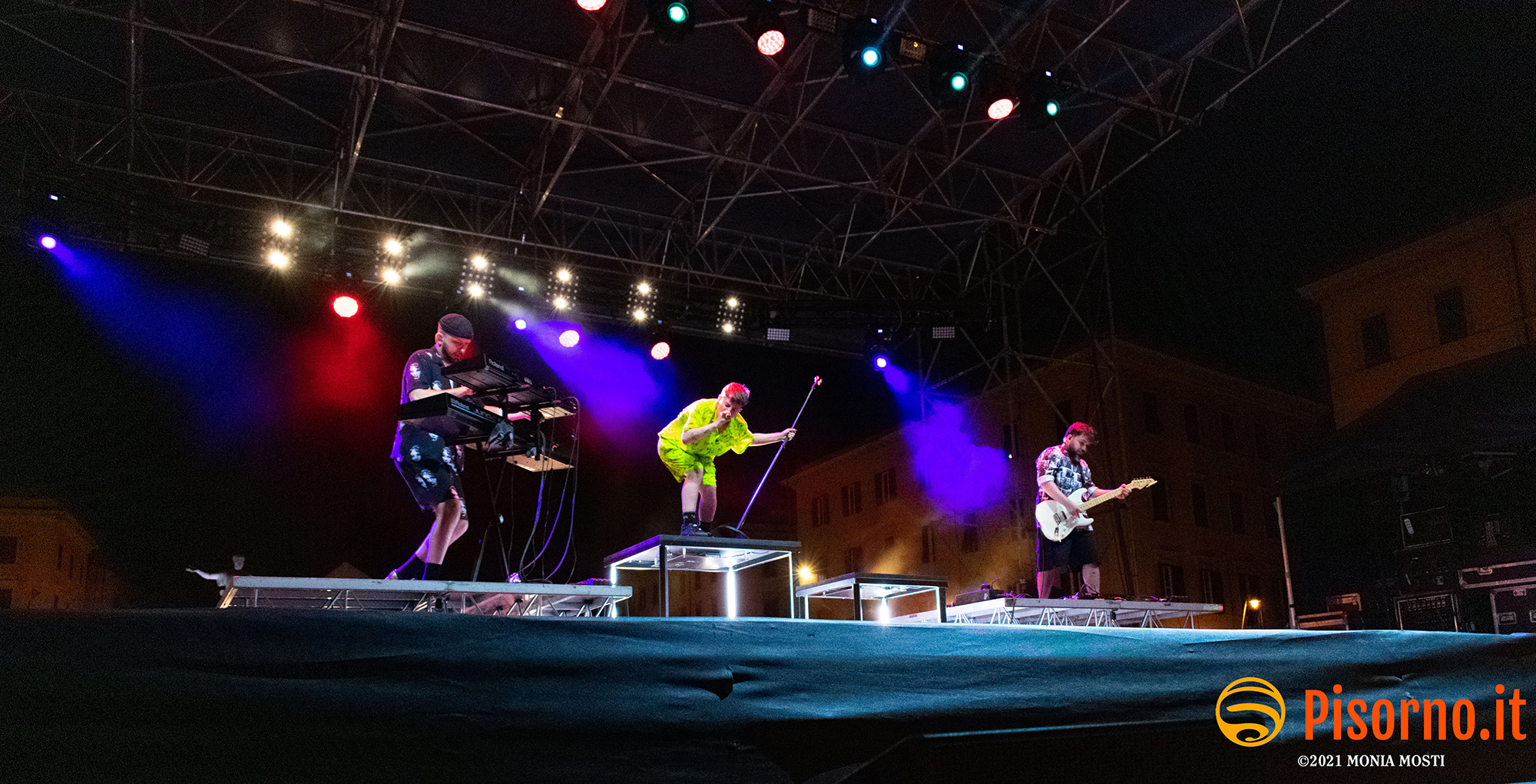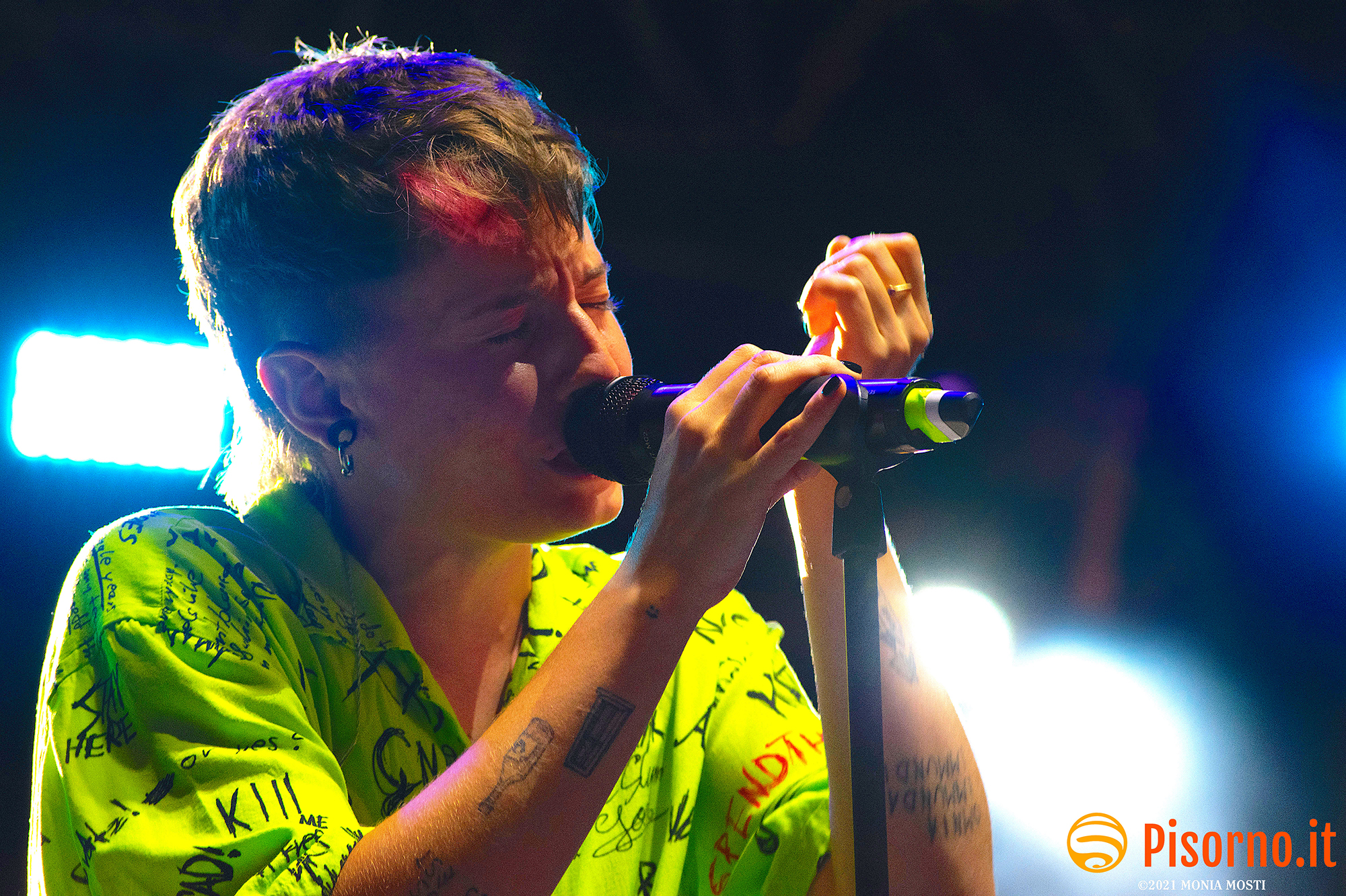 Arriva dalla platea Benedetta Alessi, la leader della band Melancholia, come a sottolineare l’importanza del rapporto tra lei ed il pubblico. I Melancholia aprono così il concerto per la seconda serata di Effetto Venezia 2021 in Piazza della Repubblica. La band diventata famosa per la sua partecipazione ad “X Factor 2020” si cimenta in cover come “Grounds” degli Idols e “Look at me” di XXXTentation fino a presentare il loro ultimo singolo “Medicine”. A metà serata la leader indiscussa invita il pubblico ad abbandonare gli smartphone per fare i video e ad usarli solo per accendere le torce perchè: “Quello che vedrete con i vostri occhi e non attraverso lo schermo di un telefono sarà qualcosa da ricordare” e così l’atmosfera diventa un qualcosa di magico da imprimere nella memoria durante l’esecuzione di “Alone”. Piacevole seppur discordante il contrasto tra l’energia di Benedetta e l’immobilismo surreale degli altri due componenti della band, ovvero Filippo Petruccioli (chitarra) e Fabio Azzarelli (tastiere – Synth). Il concerto si chiude con “Léon” e con un bis (Medicine) durante il quale il pubblico si stringe tutto attorno alla voce impeccabile di Benedetta.