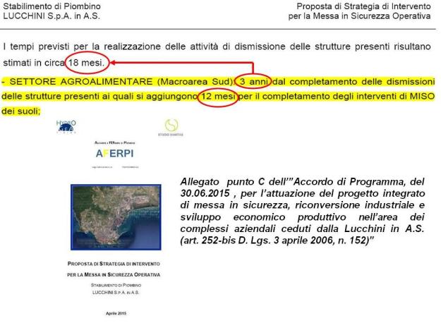 In ogni caso I lavoratori devono sapere che, considerando  le stime temporali di massima  per l’attuazione del progetto Piombino agroindustria ,(consistente nella realizzazione delle attività previste dal piano industriale e la dimissione degli impianti esistenti, oltre agli interventi di MISO, come descritto dall’Azienda  nel documento di Proposta di Strategia di intervento, per la Messa in Sicurezza Operativa in data Aprile 2015), senza imprevisti e ulteriori  ritardi  (ad oggi siamo già in ritardo di 7 mesi), il progetto agroindustriale, si presume, potrà essere terminato a marzo del 2021 più il ritardo già accumulato, di conseguenza imponendo il prolungarsi del periodo di enormi sacrifici e dolorose rinunce a carico dei  lavoratori e delle loro famiglie ledendo ancora di più  la loro dignità. Da qui la necessità improrogabile di un intervento governativo per garantire un reddito (che non sia di ammortizzatori sociali) ai lavoratori senza occupazione per opere straordinarie di sistemazione e rilancio del territorio.