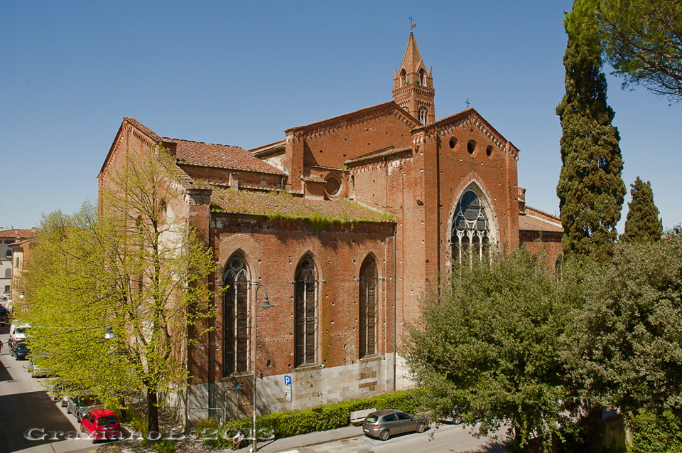 Il primo insediamento francescano in Pisa avvenne già all’epoca della predicazione di Francesco d’Assisi, che, secondo un’antichissima tradizione, sarebbe passato per questa città nel 1211 e vi avrebbe lasciato un piccolo gruppo di suoi frati. In realtà i documenti che ne rimangono oggi attestano la presenza a Pisa di Frati Minori soltanto otto anni dopo, ovvero dal 1219. In questo primo periodo si riunivano per le preghiere in una chiesetta dedicata alla SS. Trinità, che poi fu affidata, nel 1228, alle loro cure, grazie anche all’intervento del Legato Pontificio Gualfredo di Castiglione.Dopo alcuni anni costruirono una propria chiesa, molto più grande, dedicata a san Francesco. La chiesa della SS. Trinità rimase all’interno del nuovo chiostro del convento e fu poi distrutta definitivamente nel 1660. Solo che ben presto anche la prima chiesa pisana dedicata a S. Francesco, risultò incapace a contenere le folle dei fedeli. Fu cosi che nel 1261, per impulso anche dell’allora Arcivescovo di Pisa, Mons. Federico Visconti (1254-1277), i Frati Minori decisero di costruire una nuova chiesa, molto più grande della precedente, e che pare fu progettata e costruita da Giovanni di Simone – l’architetto del Camposanto Monumentale e della torre pendente di Pisa – secondo le direttive fissate dal Capitolo Generale dell’Ordine tenuto a Narbona nel 1260 per la costruzione degli edifici di culto francescani.