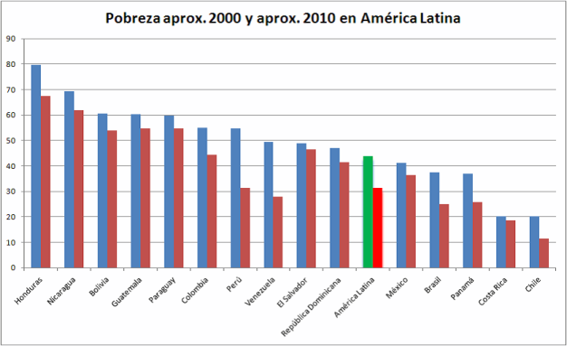 Grafico 1: povertà relativa in alcuni paesi latinoamericani e nell’intero sub continente (2000-2010). Fonte Cepal