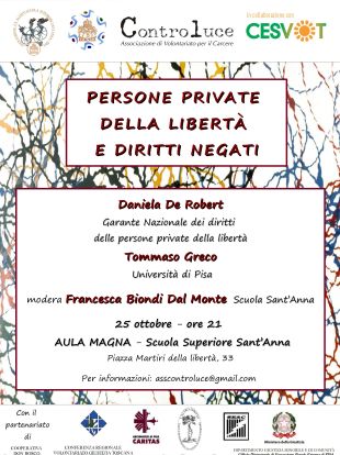 “Persone private della libertà e diritti negati”. È il titolo dell’evento promosso dall’associazione di volontariato penitenziario Controluce e dalle associazioni Allievi ed ex Allievi della Scuola Sant’Anna in collaborazione con il Cesvot e con altre realtà del territorio, che si terrà giovedì 25 ottobre, alle 21, nell’Aula Magna della Scuola Sant’Anna di Pisa, in Piazza Martiri della Libertà, 33.