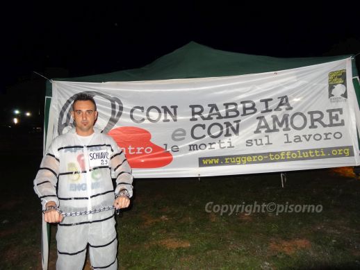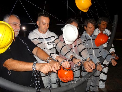 Lo striscione dell’Associazione “Ruggero Toffolutti” contro le morti sul lavoro campeggia appeso al gazebo, del resto Ruggero restò vittima nel 1998 in Magona (oggi Arcelor Mittal) di quello sfruttamento cui i manifestanti non intendono sottostare, neppure sotto il pesantissimo ricatto occupazionale che qui riguarda non solo i dipendenti Lucchini.Si fanno le foto agli “schiavi” incatenati, per postarle su facebook. Si parla della crisi, e anche delle guerre in Libia come in Afghanistan, in cui l’Italia è parte pericolosamente attiva. Si ride e si scherza, salutando i numerosi visitatori, uomini e donne che vengono a dire “sono con voi” a questi lavoratori così carichi di storia, così moderni.
