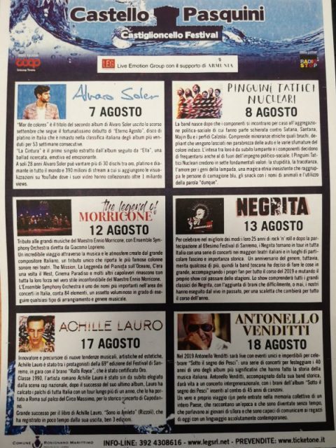 Torna il Castiglioncello Festival, dopo che l’edizione 2018 aveva portato artisti come Francesco De Gregori, Fiorella Mannoia e Giovanni Allevi. E lo fa nella stessa location, il parco di Castello Pasquini, con un palco e un service audio/luci completamente rinnovato e con l’aggiunta di una tribuna che allarga la capienza della platea a circa 2900 posti a sedere.